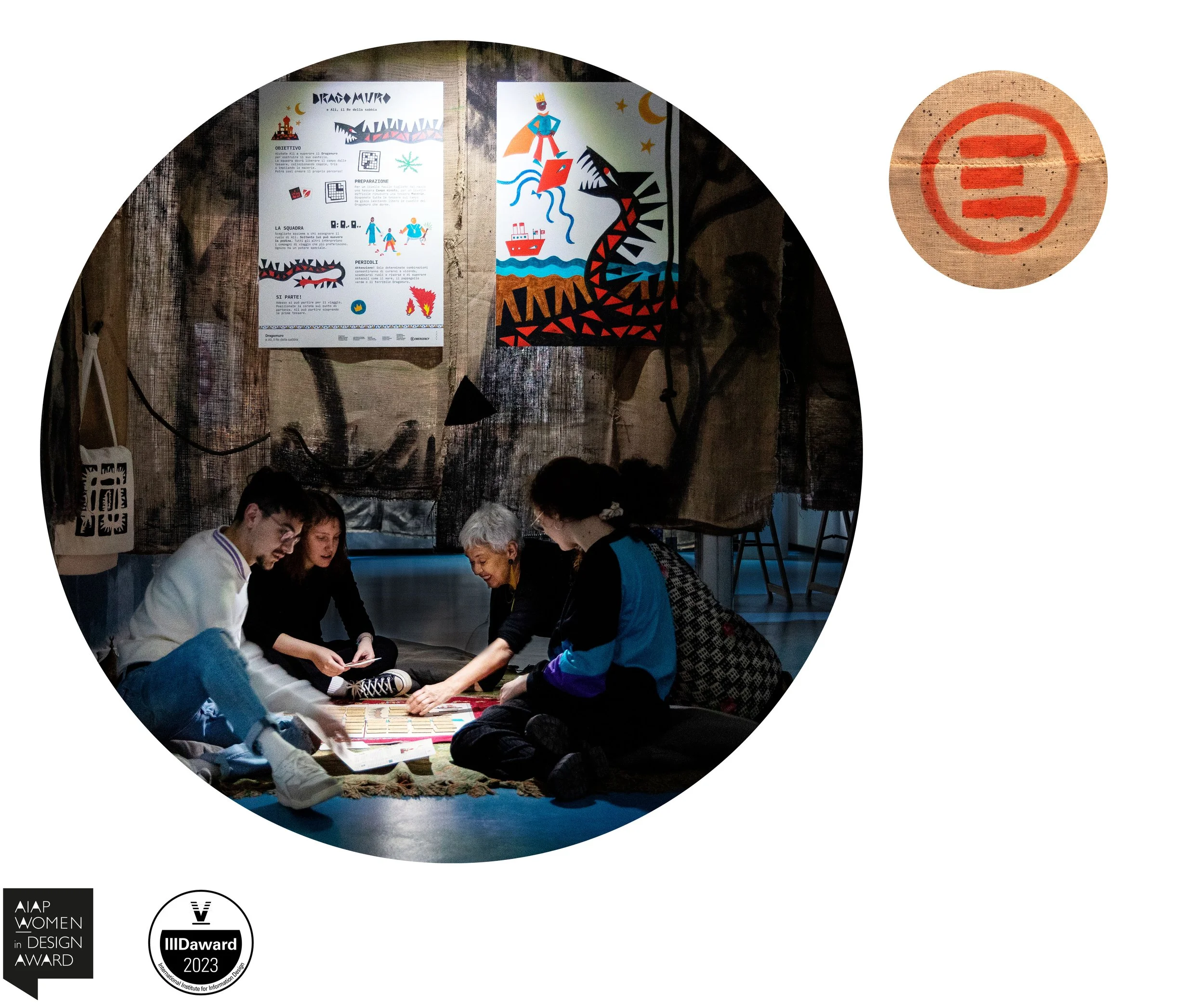 The exhibition, entitled "The Game. The Role of Emergency", presents a series of board games on the theme of migration related to climate change and wars, developed in collaboration with Emergency. “The Game” is the ironic slang term many migrants use to describe their attempt to cross borders while avoiding suffering, rejection, and violence. It is a semantic coincidence too significant not to highlight. A total of 172 jute sacks have been painted to evoke the landscapes of migratory routes: wild forests, seas and war zones. Visitors experience the exhibition in an immersive environment crafted from recycled materials, which evoke the settings represented in the games.